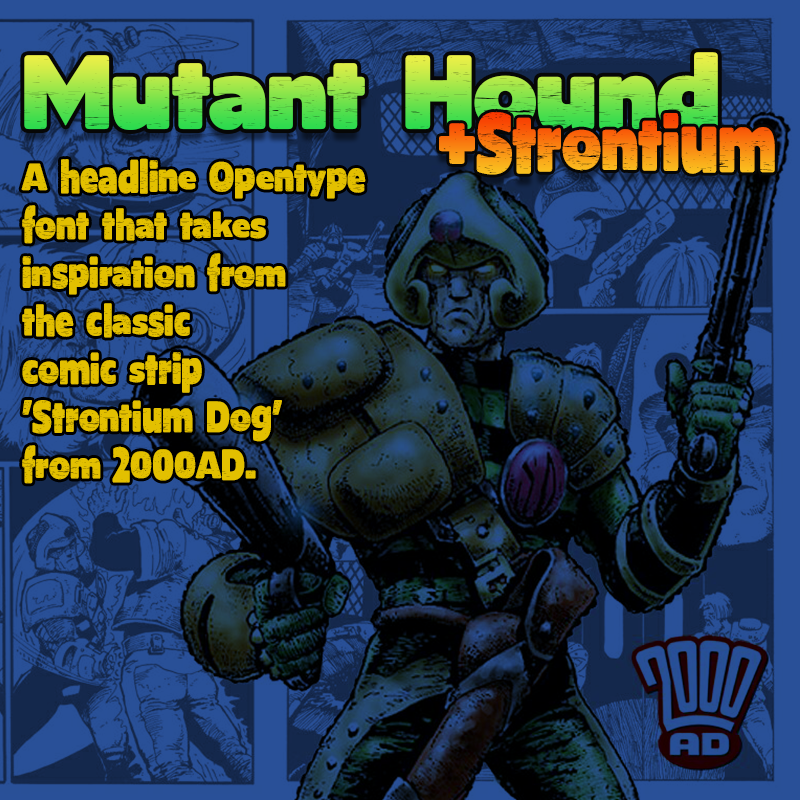 A headline Opentype font that takes inspiration from the classic comic strip ‘Strontium Dog’ from 2000AD.