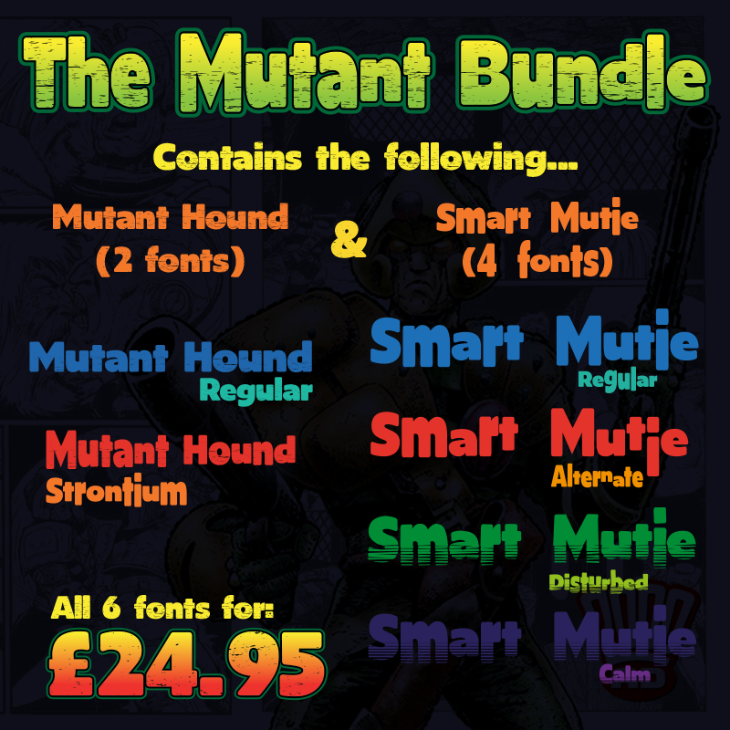 Or buy all six fonts (Smart Mutie and Mutant Hond) in the Mutant Bundle from the drop down menu